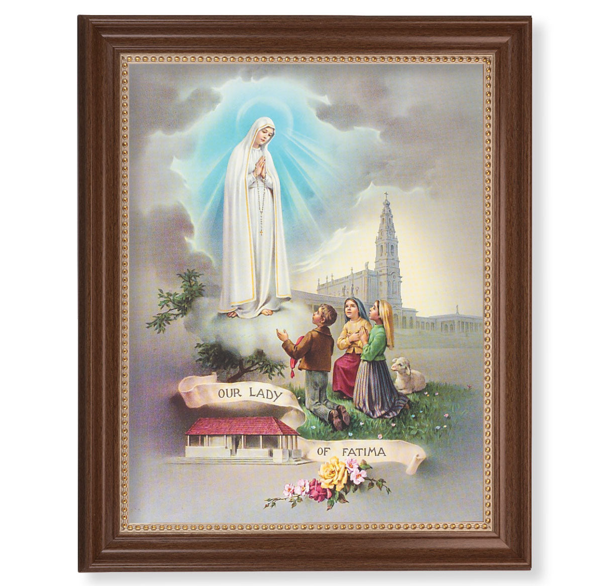 Enhance your space with the stunning Our Lady of Fatima Picture Framed Wall Art Decor Extra Large. This exquisite piece combines timeless elegance with spiritual significance, making it an ideal addition to any home or office. The classic dark walnut finished frame, accented with a gold beaded lip, exudes sophistication and provides a warm backdrop to the beautifully textured print of Our Lady of Fatima.