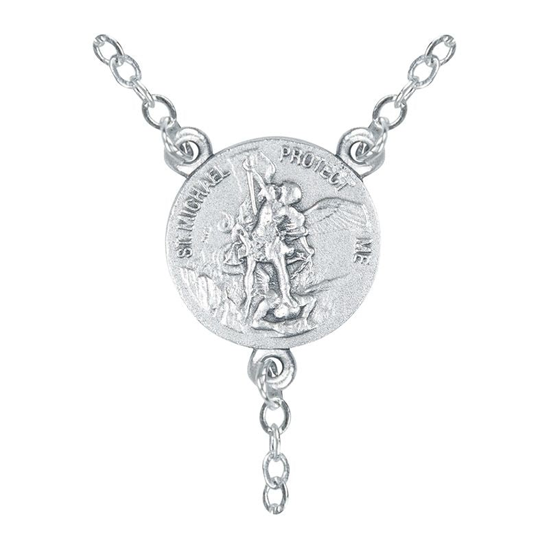 At the heart of the rosary lies a stunning 3/4 inch round centerpiece embellished with the U.S. Army seal. On its reverse side, you'll find a beautifully stamped image of St. Michael, accompanied by the powerful words "St. Michael Protect Us." This symbol serves as a reminder of divine protection and guidance, making it a perfect gift for military personnel and their families.