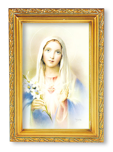 Transform your space with the stunning Immaculate Heart of Mary Picture Framed Wall Art Decor, Small, Antique Gold-Leaf Finished Frame with Acanthus-Leaf Edging. This exquisite piece features a beautifully designed Italian gold-stamped print, perfectly encased in a luxurious antique gold-leaf finished frame that measures 5-1/2" x 7". Its elegant acanthus-leaf edging adds a sophisticated touch, making it a striking addition to any room.
