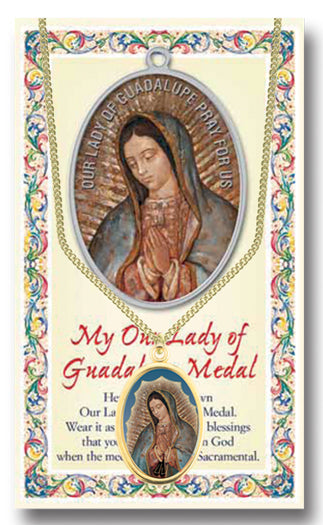 Discover the beauty and spiritual significance of the Our Lady of Guadalupe Epoxied Medal Pendant Necklace with 18" Chain. This exquisite piece features a meticulously crafted gold-embossed oval medal that serves as a reminder of faith and devotion. The vibrant colors and detailed design of the medal are enhanced by a protective epoxy finish, adding durability and shine, making it an ideal accessory for daily wear or special occasions.