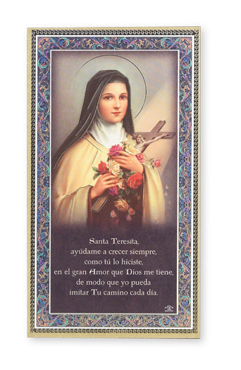 Enhance your home decor with the exquisite St. Therese (Spanish) Gold Foil Wood Plaque Wall Art Decor, Small. This beautifully crafted wood plaque measures 5" x 9", making it the perfect size for any wall in your home. Featuring a heartfelt prayer in Spanish, this piece serves as a daily reminder of faith and devotion.